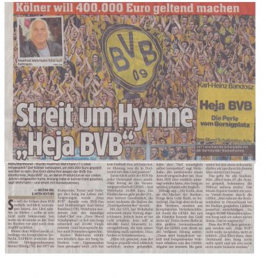 https://www.express.de/sport/fussball/wirbel-stadionhymne-heja-bvb-koelner-fordert-400-000-euro-39644 Herr Hömig, der Urheber des Werkes Heja BVB, haben wir bei der Staatsanwaltschaft Köln wegen uneidlicher Falschaussagen angezeigt. Er gab seit 47-zig Jahren seine Zustimmung und wir erhielten seine Akzeptanz, dass wir die Verwertungsrechte…