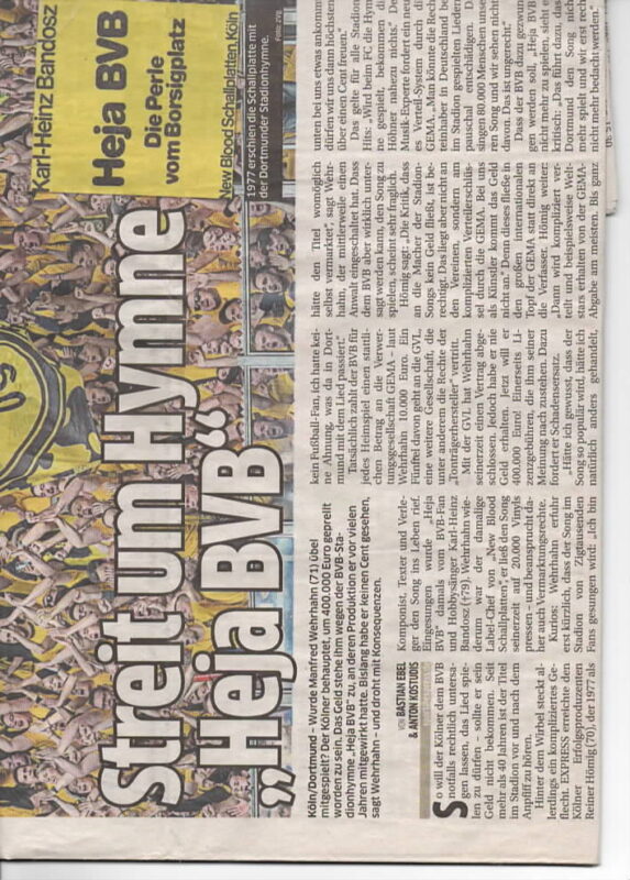 Wesentlich ist, dass Herr Hömig seit 1977 kooperativ meine Rechtewahrnehmung zum Lied „Heja BVB“ gegen die GVL förderte und ohne Beanstandungen mir die Nutzungs- und Verwertungsrechte seit 1977 uneinge-schränkt zugesprochen hat. Er hat mir mit der Bandübergabe, das von mir finanzierte und organisierte Musikprodukt „Heja BVB“ mit dem Sänger Karl-Heinz Bandosz u. w. Interpreten, die von BVB benannt waren, wie auf den Laben „NEW BLOOOD Schallplatten“ ersichtlich ist, die Nutzungs- und Verwertungsrechte übertragen. Was auf dem Label steht, ist auch drin. Herr Hömig hat mehrfach die Angaben bestätigt.